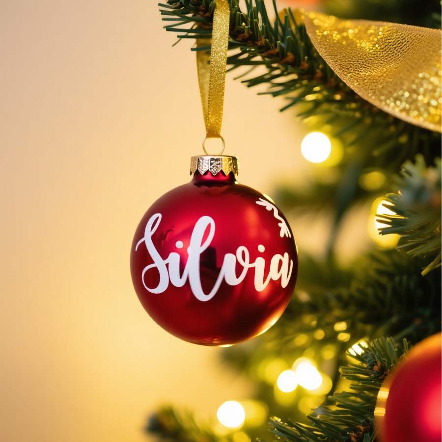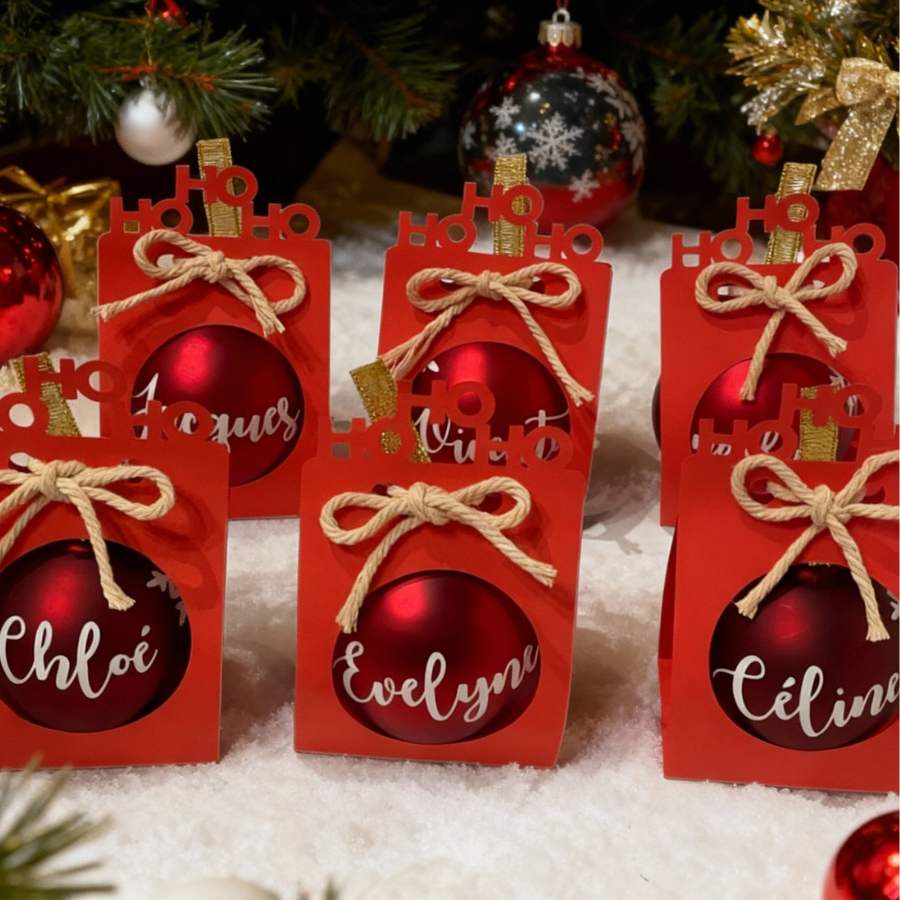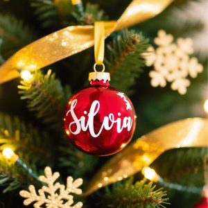 Bolas de Navidad de vidrio en rojo mate o brillante con decoración de nombre a elegir en vinilo blanco, se podrán añadir copos de nieve si se desea. Incluyen lazo a elegir entre terciopelo rojo o dorado. Vienen acompañadas de una cajita como se muestra en la foto y una cuerda en caso que se desee usar como regalo. Una vez realizado el pedido, nos pondremos en contacto contigo para personalizar la bola con el nombre y la tipografía que más te guste. Un detalle elegante y listo para colgar o regalar.